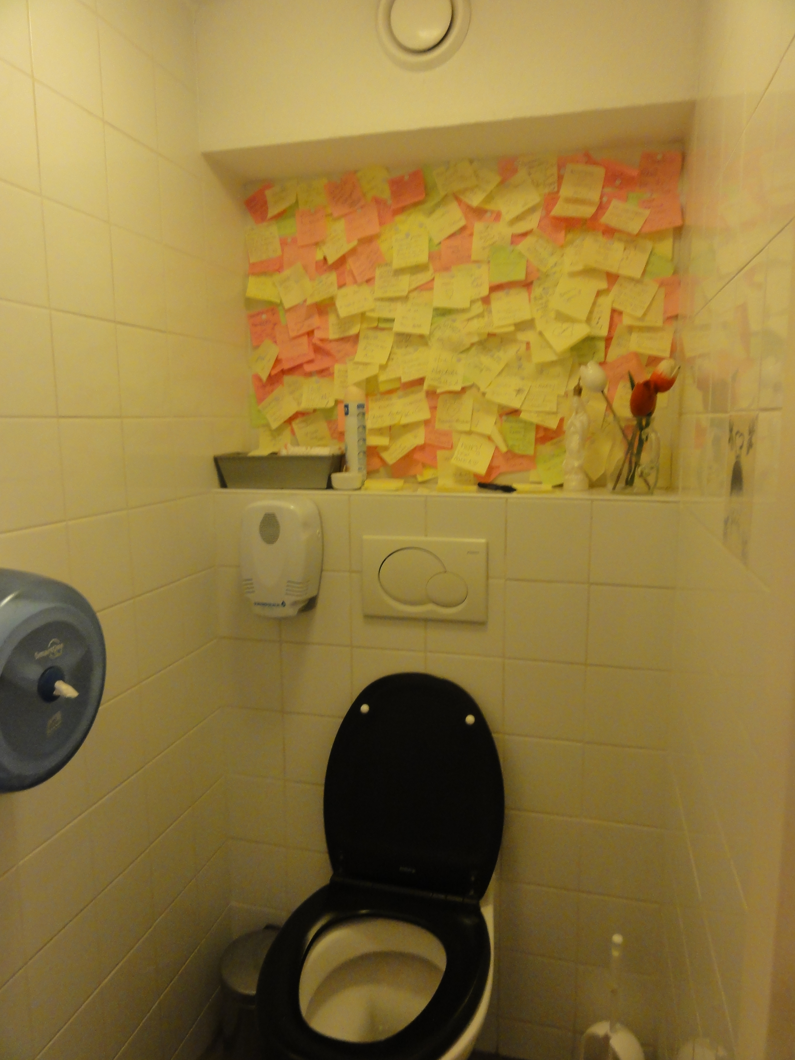 Geproefd: Eten en drinken is elk jaar een heel belangrijk onderdeel van onze citytrip, en dat was dit jaar niet anders. De volgende items zijn op drie dagen tijd in onze twee magen beland zijn: minstens 20 thee’s, een stuk kaastaart, een muffin, een witte-chocolade-koekje, vier belegde broodjes, 1 frappuccino, 3 chai tea latte’s, liters water, een stuk appeltaart, een bord tomaat-mozarella, kleine broodjes met lookboter, een pizza met salami, ravioli met preisaus, ontelbaar veel sushi-tapas (lang leve all you can eat), een hartige pannenkoek, een pannenkoek met appel en ijs, poffertjes met chocoladesaus, american pancakes met banaan, drie heel dure pralines, twee kommetjes yoghurt met gedroogd fruit, twee borden roerei met spek, twee pistolets met brie, een halve meloen, drie kleine gehaktworstjes, een kommetje cornflakes, drie minikoffiekoekjes. En dat zijn dan nog maar de dingen die ik mij herinner. Elk jaar fretten we zo veel, en toch slagen we er elk jaar in om niet te verdikken door die uitstapjes. We wandelen drie dagen lang, van ’s morgens vroeg tot ’s avonds laat, als we stappentellers zouden gehad hebben zouden die waarschijnlijk ontploft zijn. Als ik het allerbeste er moet uitpikken, dan zijn het de american pancakes met banaan. Die waren zo dik, zo fluffy, zo zoet, zo smeuïg, zo formidastisch lekker. We hebben ze trouwens gegeten bij Pancakes!, in de Berenstraat. Je kan er niet reserveren en er staan tot buiten mensen aan te schuiven. Maar je kan je wel op een lijst laten zetten, en dan een half uurtje later terugkomen en hopen dat het bijna aan jou is. En als je er dan binnen geraakt, laat dan zeker een post-it achter op de wc.
