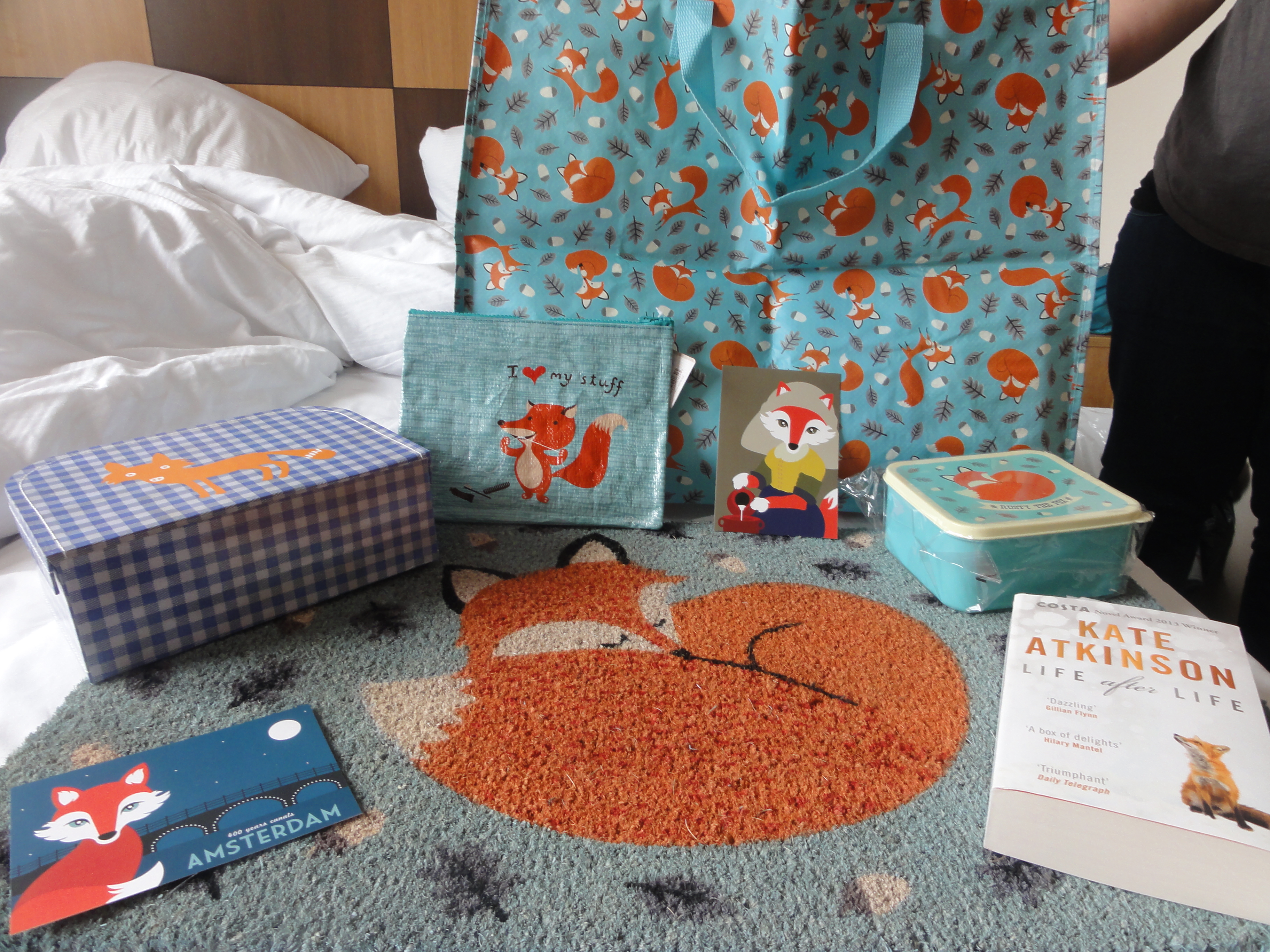 Gevoeld: Opluchting, omdat ik er in geslaagd was om gezond te blijven. Vorig jaar gingen we normaalgezien naar Dublin, maar ik heb toen twee weken in mijn bed gelegen met een zware infectie op mijn luchtwegen. We hebben dus twee dagen voor we vertrokken alles moeten annuleren, en dat heeft mij veel tranen en vooral veel geld gekost. Dus ik was gewoon al blij dat we dit jaar wel zijn kunnen vertrekken. Ik heb ook veel buikpijn gevoeld, van het lachen. En ook een soort herkenning, alsof ik daar wel op mijn plaats zat. Ik heb al wel wat landen gezien in mijn leven, en de meeste landen zijn wel geschikt om een paar weken op je effen te komen, maar ik was toch altijd wel blij dat ik terug thuis was. Nu was ik natuurlijk ook blij dat ik thuis kwam, maar ik kreeg wel het gevoel dat ik daar zou kunnen aarden, en echt zou kunnen wonen. Dat heb ik in nog maar één ander land gehad, en dat was in Ierland. Het universum gaf mij trouwens ook signalen dat ik naar Amsterdam moet emigreren, want overal waar ik keek zag ik dingen met een vos op. En ik moest die ook ALLEMAAL kopen. Het bewijs staat op onderstaande foto.