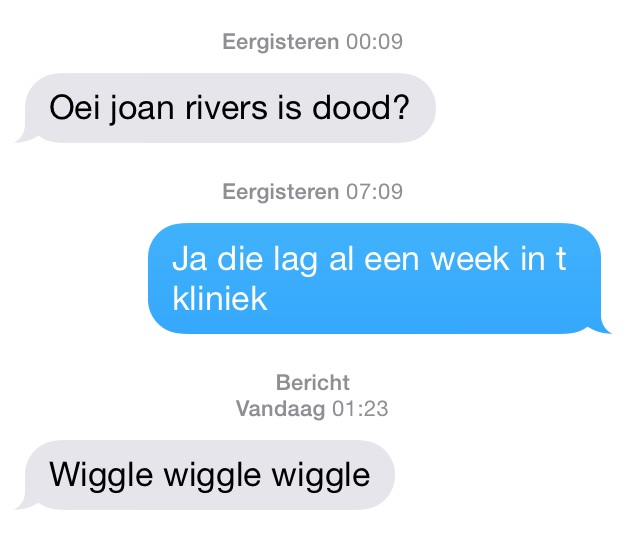 Gehoord: “Oei sorry, stoor ik?” toen mijn mannelijke BFF mij om 1 uur ’s nachts wakker belde omdat hij zijn sleutel thuis vergeten was en hij onze reserve nodig had. En dan nog eens de ping van mijn gsm toen diezelfde BFF de nacht nadien om 1u23 een bericht stuurde met alleen maar “wiggle wiggle wiggle” in. Het is een geruststelling in het leven om te weten dat je vrienden even geschift zijn als jij zelf.